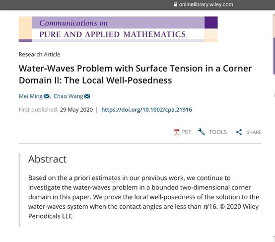 近日,拉斯维加斯5357cc明梅副教授与合作者的论文“Water waves problem with surface tension in a corner domain II: the local well-posedness”在国际顶尖数学期刊Communications on Pure and Applied Mathematics(CPAM)上在线发表。CPAM由国际最负盛名的应用数学研究所之一—柯朗数学科学研究所(Courant Institute of Mathematical Sciences)于1948年创刊,发表纯粹与应用数学、数学物理等研究领域具有突破性的一流研究成果。该杂志每年刊载不到百篇论文,在数学界有极高的知名度和影响力,属于数学类最顶尖的期刊之一。例如,CPAM曾在2013年被ISI Journal Citation Reports评价为302种入选数学类刊物第一名。