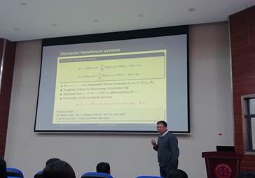 洪佳林研究员进行了主题为《Stochastic Symplectic Methods and Numerical Ergodicity of Stochastic Nonlinear Schrödinger Equation》的学术报告,洪佳林研究员用通俗易懂的语言向师生们介绍了随机辛几何方法与随机非线性薛定谔方程的数值遍历性,从背景到理论再到方法应用。以探究太阳系稳定性为背景,引出辛性和遍历性,解偏微分方程的随机辛几何算法和随机非线性薛定谔方程算法,随着该问题的进一步深入,他还介绍了该方法的构造和理论分析,不变测度和数值遍历性,目前研究工作及文献推荐等。在学术报告中,洪佳林研究员多次强调计算数学的重要性与解决问题的科学方法,阅读文献与积极探究相结合的重要性,并耐心的帮助师生解答学术上的疑惑。