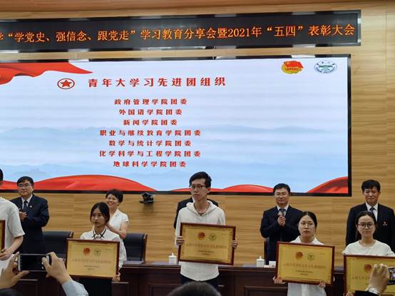 在本次表彰大会中,我院团委荣获“青年大学习先进团组织”称号,2018级信息与计算科学专业的彭涛同学荣获“优秀共青团员”称号,2018级统计学专业的晏娇同学荣获“优秀青年志愿者”称号。在会中,我院2018级信息与计算科学专业的彭涛同学作为“优秀共青团员”获奖代表,与大家分享了自己如何从校、院、班三级层面学好党史这门“必修课”,并强调“中国共产党的百年奋斗史,也是一部恢弘的青年奋斗史,百年光辉历史积淀了我们党独有的青春蓬勃力量。作为新时代的青年学生党员,要学好党史这门“必修课”,夯实思想基础、校准行动方向。”