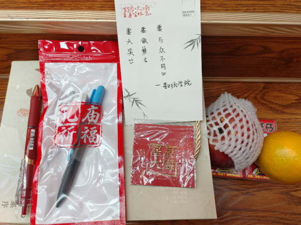 在考研礼包中,除了文具、水果、零食外,每一份礼包还含有一张由数统学院青协自律委组织,来自大一的同学为学长学姐写下祝福的明信片。这一张张寄寓着学弟学妹美好祝愿的明信片,希望能够在这寒冬之际,为备战的学长学姐们带来一份温暖,助力他们的考研升学梦。