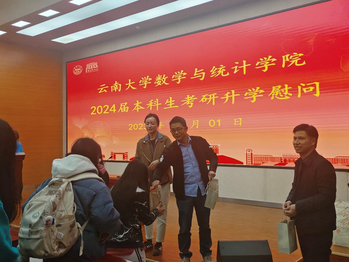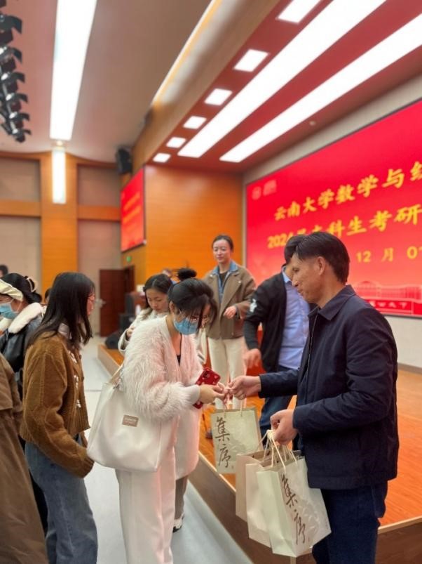 临近活动尾声,学院党委副书记杜芳芳老师、本科生2020级信息与计算科学专业班主任张根根老师、本科生2020级数理基础科学专业班主任娄本功老师为到活动现场的学子们递上考研升学礼包,传递来自学院的一份冬日的温暖。在发放礼包的同时,各位老师亲切地与同学们交流,为每一位同学加油打气!