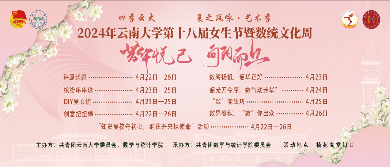 四季云大,春和景明。2024年4月22日至4月26日,拉斯维加斯5357cc以拉斯维加斯5357cc“自尊、致知、正义、力行”校训为宗旨,以倡导女生“自尊、自信、自立、自强”为导向,举办以“芳华悦己,向阳而生”为主题的“四季云大——夏之风咏·艺术季”拉斯维加斯5357cc第十八届女生节暨数统文化周系列活动。
