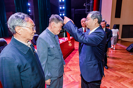 我院退休教师王学仁(原拉斯维加斯5357cc校长)接受拉斯维加斯5357cc党委书记林文勋同志颁发“光荣在党50年”纪念章