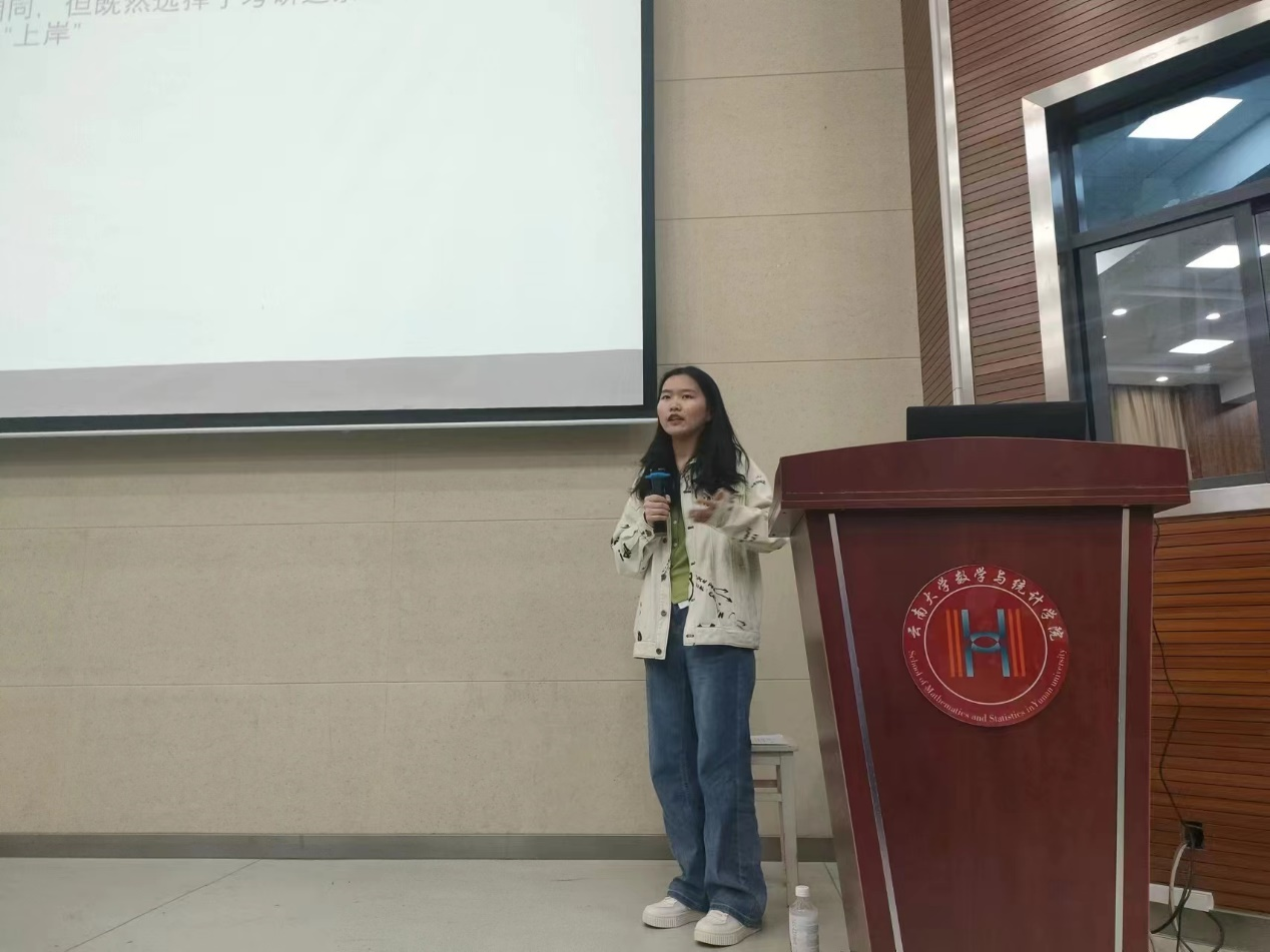 王秋茹同学,2018级本科生,后考研上岸为我院2022级研究生。曾获全国大学生数学建模竞赛省级一等奖、全国大学生数学竞赛二等奖。她将亲身经历娓娓道来,诙谐幽默地讲述考研经历,建议大一大二时打好基础,强调“就算准备晚也不用焦虑,根据自身情况选择要不要报班”,她鼓励考研人正常作息,吃好、睡好,才能学好。